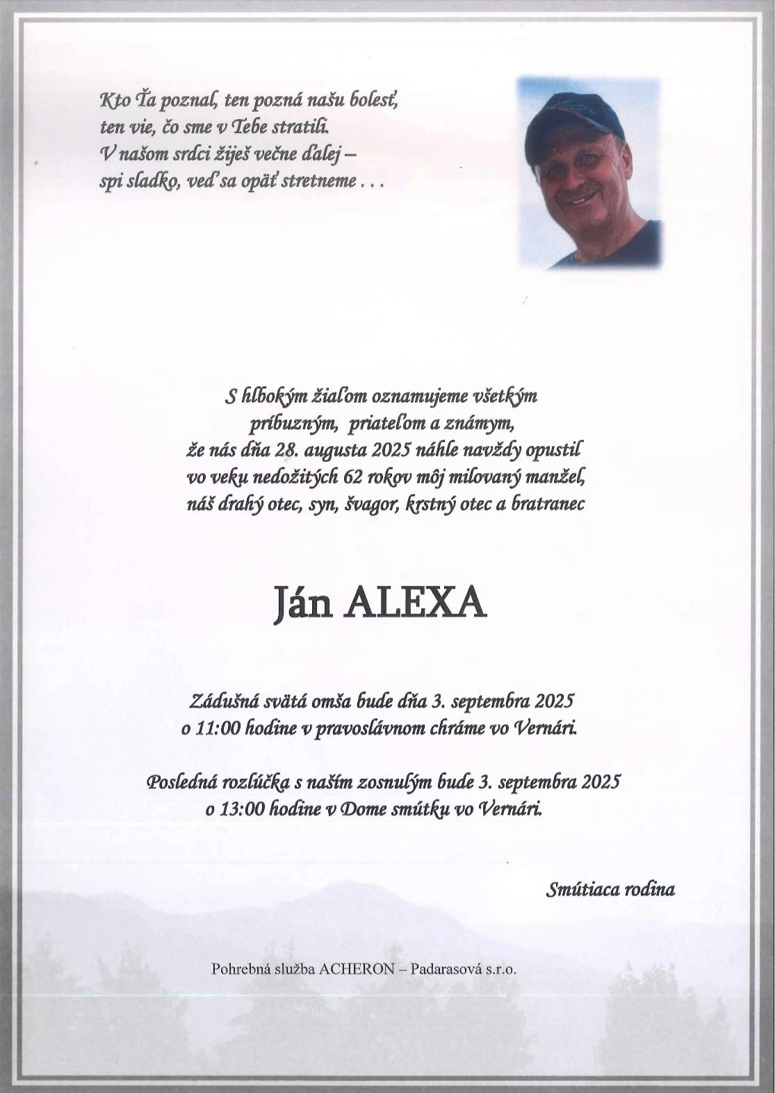 Okres Poprad zasiahla veľmi smutná správa. Vo veku nedožitých 62 rokov náhle zomrel koncom augusta Ján Alexa. Bol podnikateľ a majiteľ Hotela Studničky v obci Vernár.