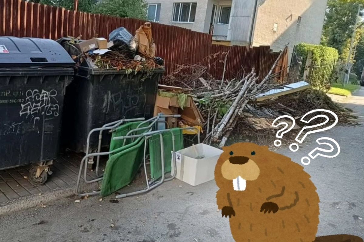 „Na tejtou fotke nevidíme prvý pokus o výstavbu hniezda bobra v centre mesta, ale v skutočnosti ide o počin invazívneho druhu ‚HOMO ODPADICUS MAXIMUS’, ktorý si myslí, že kontajnery na komunálny odpad sú čarovné skrinky, kde zmizne všetko – od konárov, cez vypletú trávu, nábytok, až po pol lesa...“ uvádzajú humorne technické služby.