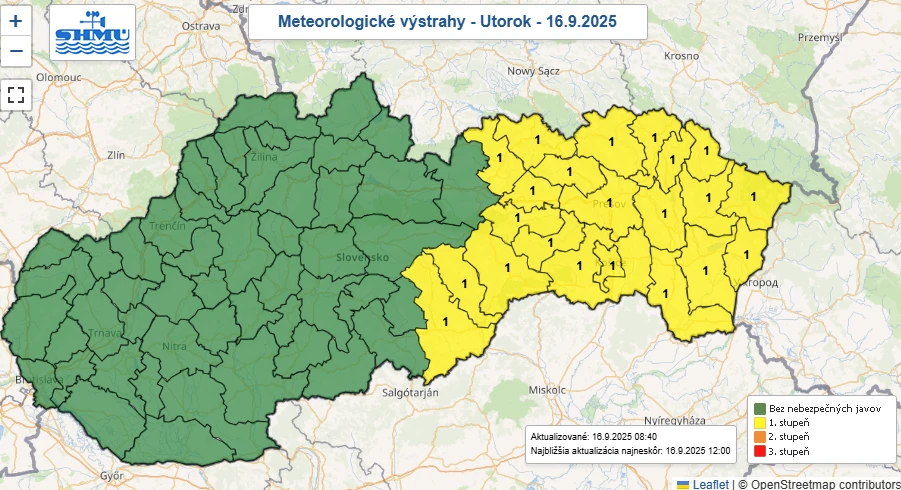 Slovenský hydrometeorologický ústav (SHMÚ) vydal meteorologické výstrahy 1. stupňa pre celé východné Slovensko s výnimkou Popradského okresu. Upozornenia platia od utorka 16. septembra 2025, 08:35 do 12:00.