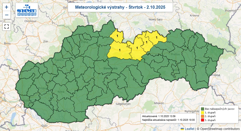 Podľa meteorológov platí výstraha od 2. októbra 2025 od 00:00 do 07:00. V okresoch Poprad, Kežmarok a Stará Ľubovňa sa od nadmorskej výšky približne 800 metrov očakáva výskyt sneženia. „Očakáva sa výskyt sneženia pri ktorom spadne okolo 1 cm nového snehu,“ uvádza SHMÚ.