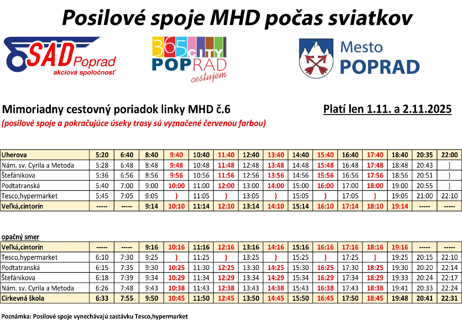 Zverejnený rozpis zároveň upozorňuje, že posilové spoje vynechávajú zastávku Tesco, hypermarket, aby sa cestovný čas skrátil a linky mohli rýchlejšie obslúžiť cintorínsku trasu.