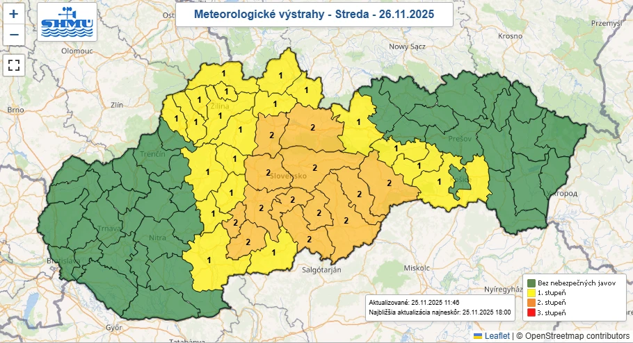 V okrese Poprad platí najskôr výstraha pred silným dažďom. SHMÚ upozorňuje, že „v okrese Poprad sa OJEDINELE očakáva výskyt dažďa s úhrnom zrážok NAD 35 mm.“ Výstraha 1. stupňa je platná od 25. 11. 2025 12:00 do 26. 11. 2025 14:00.