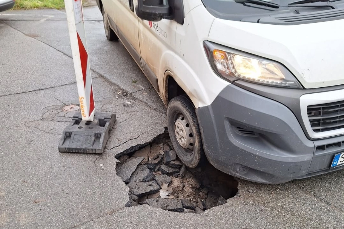 Aktuálne je tam veľká, nebezpečná diera. Aj keď na obrovskú dieru upozorňuje dopravné značenie, dvaja vodiči vo štvrtok nemali veľké šťastie. Najskôr tam podľa autora príspevku zapadlo smetiarske auto a len o pár hodín aj kuriérska dodávka.