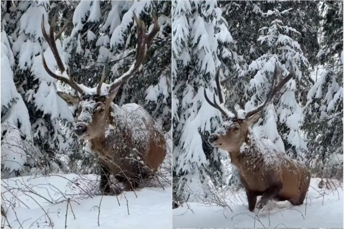 Na záberoch je vidieť nádherné zasnežené prostredie a majestátneho jeleňa, ktorý sa nečakane objavil medzi stromami. Opatrne prešiel okolo turistov a prebehol po trase. Celé stretnutie prebehlo v pokoji, no z oboch strán s rešpektom.