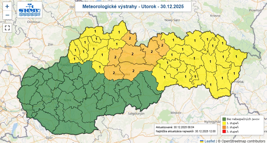 Slovenský hydrometeorologický ústav (SHMÚ) vydal výstrahu prvého stupňa pred snehovými jazykmi a závejmi, ktorá je aktívna práve dnes v niekoľkých okresoch naprieč krajom, ktoré platia celý utorok.