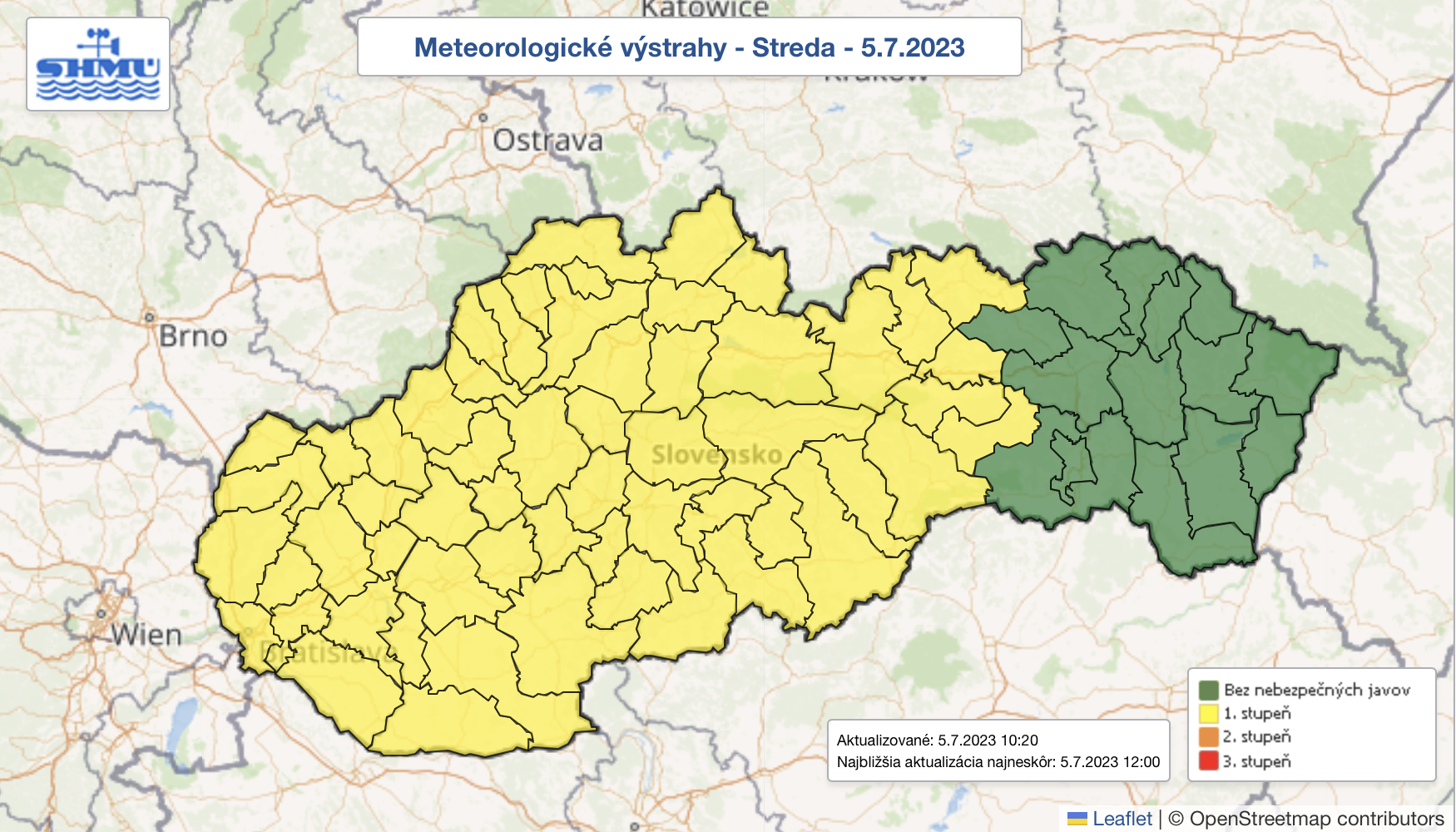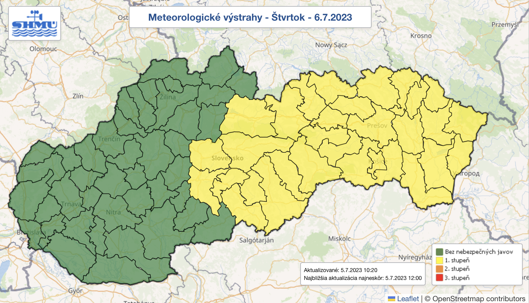 Vo štvrtok sa búrky presunú na východnú časť Slovenska a budú pretrvávať takmer celý deň. Pre celý Prešovský kraj sú na tento deň vydané výstrahy prvého stupňa. Štvrtkové výstrahy budú platiť od polnoci do 19:00 hod.