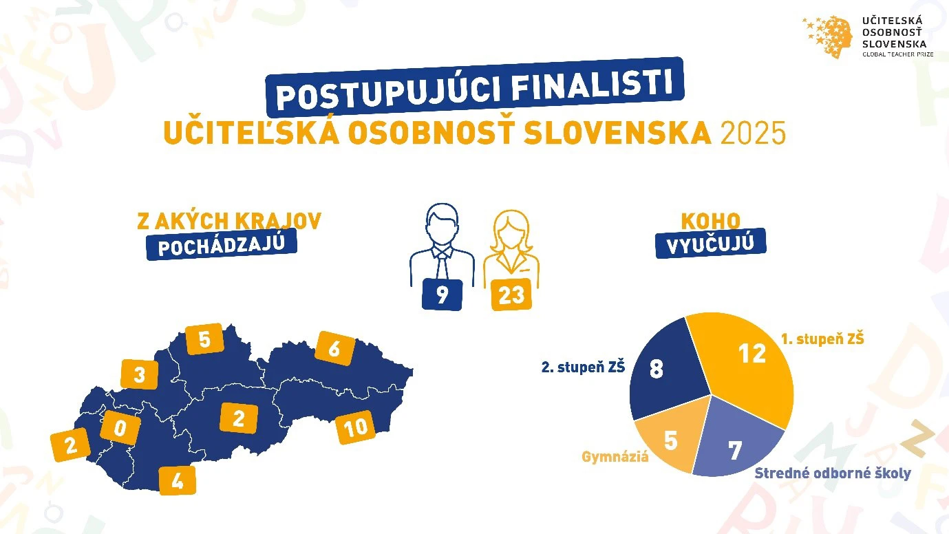 Ocenenie Učiteľská osobnosť Slovenska 2025 predstavilo tohtoročnú finálovú zostavu najlepších pedagógov, ktorú vybrala odborná porota z rekordných 191 prihlášok. Tento rok vybrali až TOP 32 učiteľských osobností z celého Slovenska. Dominujú prihlášky z Prešovského a Košického kraja, ktoré tvoria až tretinu finálového výberu. Vzácnosťou je, že takmer tretinu finalistov tvoria muži, čo je v slovenskom školstve vzácnosťou.