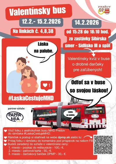 Súčasťou valentínskej iniciatívy je aj fotosúťaž „Láska cestuje MHD“, ktorá prebieha od 4. do 15. februára 2026 na facebookovej stránke DPMP. Zapojenie je jednoduché. Páry sa môžu odfotiť počas jazdy v ktoromkoľvek autobuse alebo trolejbuse MHD, fotografiu vložiť do špeciálneho valentínskeho fotorámčeka DPMP a zverejniť ju v komentári pod súťažným príspevkom s hashtagom #LaskaCestujeMHD.