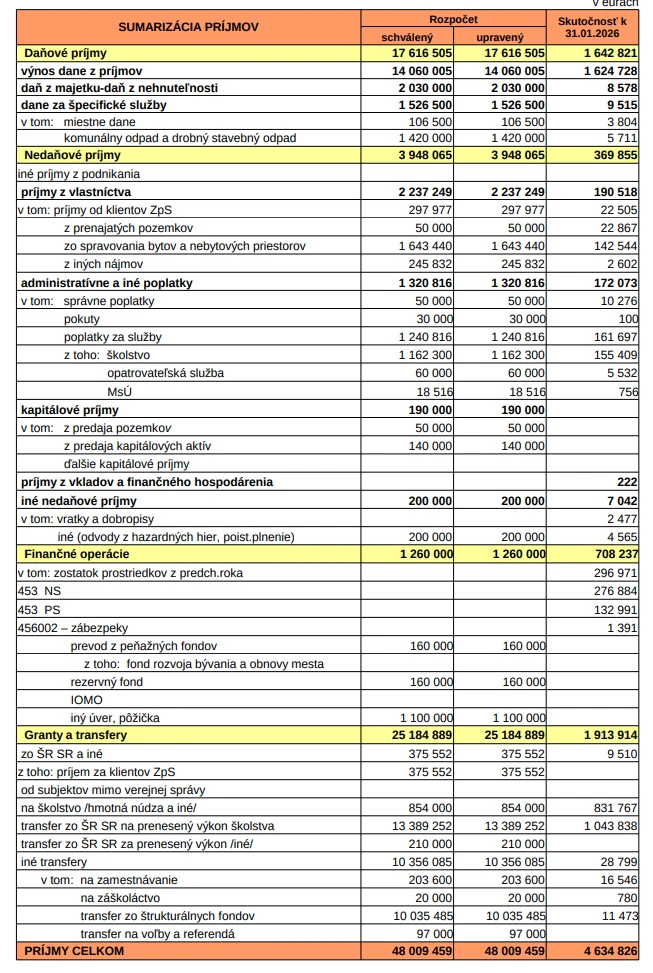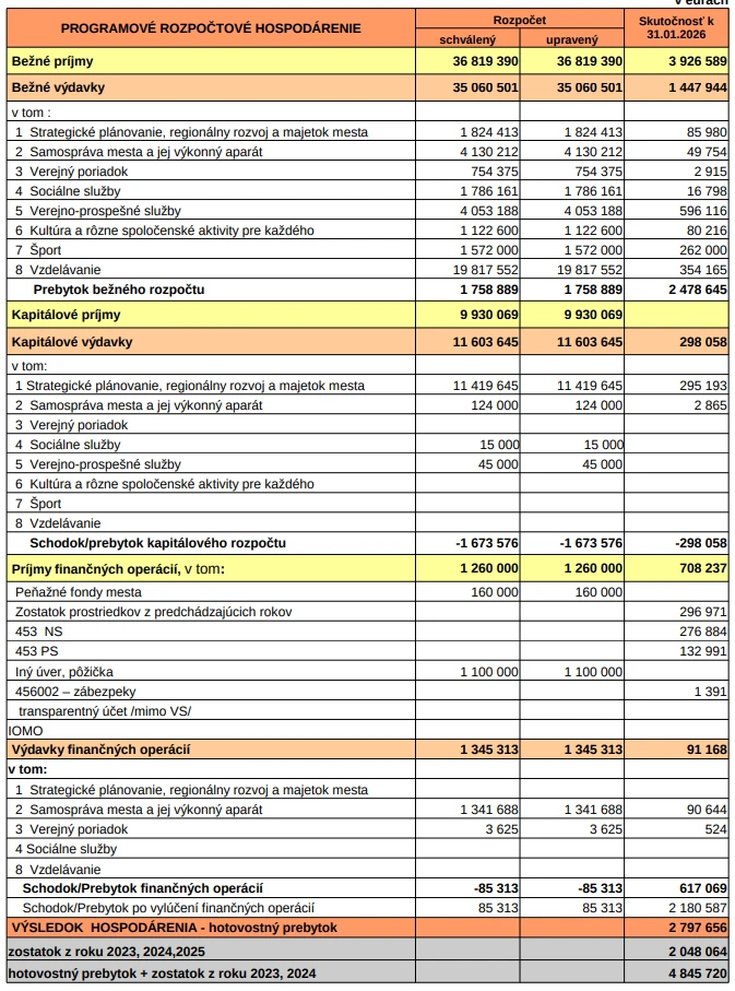 Humenné zverejnilo Výsledky hospodárenia k 31. januáru 2026 a prvé čísla podľa zverejnených dát vyzerajú viac než priaznivo. Samospráva vstúpila do nového roka so silným finančným základom a výrazným prebytkom medzi príjmami a výdavkami.
