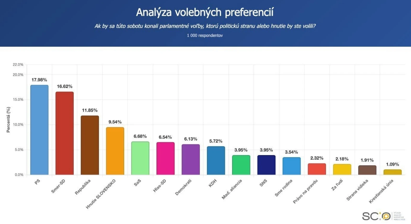 Progresívne Slovensko by aktuálne získalo 17,98 percenta hlasov. Oproti januáru tak stratilo viac ako štyri percentuálne body. Na druhom mieste by skončil Smer-SD so ziskom 16,62 percenta. Tretia priečka patrí hnutiu Republika (11,85 %).