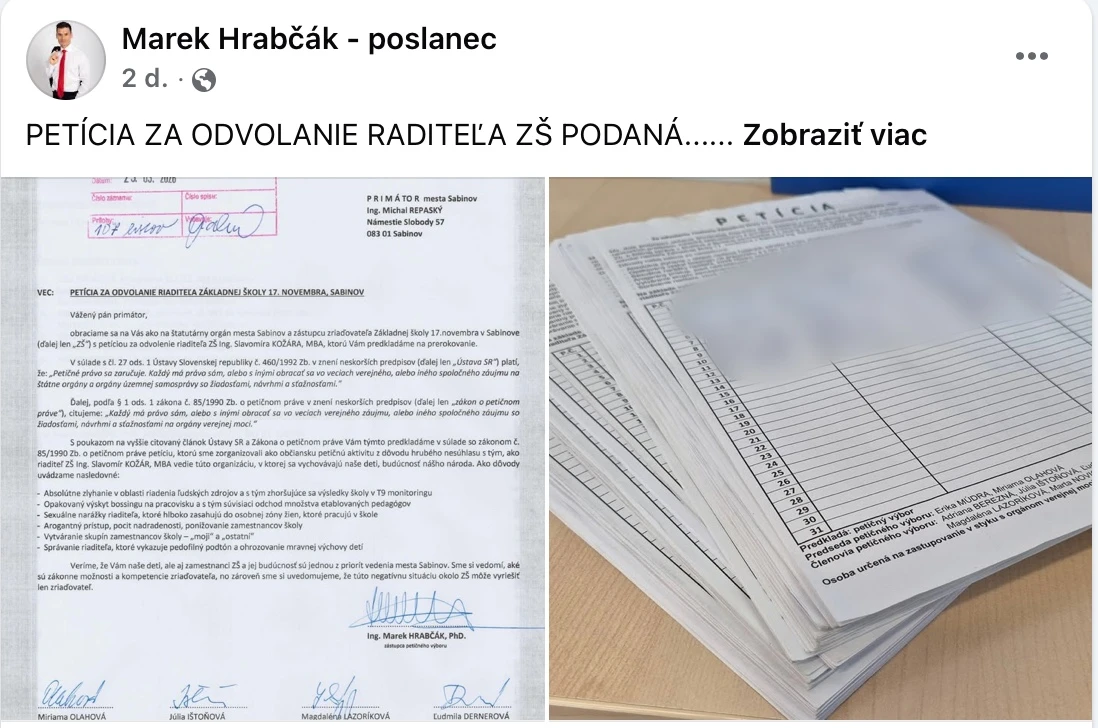 Riaditeľ Základnej školy 17. novembra Sabinov Slavomír Kožár je pod paľbou kritiky. V pondelok 23. marca bola na podateľňu mestského úradu podaná petícia za jeho odvolanie. Medzi dôvodmi, ktoré sú uvedené v sprievodnom liste, sa nachádzajú napríklad aj sexuálne narážky riaditeľa, arogantný prístup či pedofilný podtón v správaní.