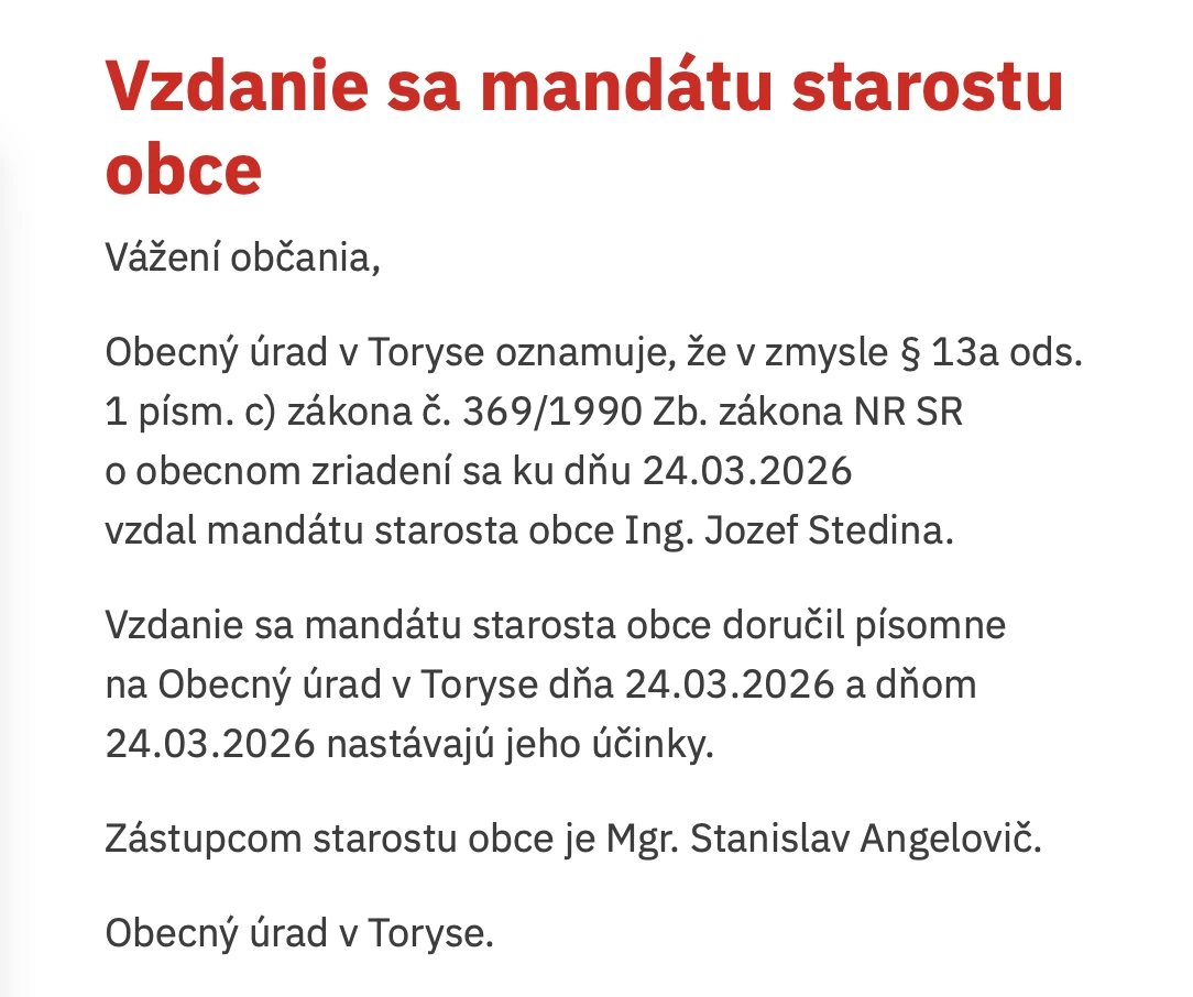 Starosta Torysy Jozef Stedina si v stredu 25. marca vypočul rozsudok, podľa ktorého mu automaticky zanikol starostovský mandát. Dôvodom je kauza z roku 2023, kedy v obci došlo aj k spíleniu topoľov, na ktoré nebolo vydané povolenie. Mandát mu zanikol bez nároku na odstupné. Na povrch však vyplávalo, že Stedina sa ho deň pred vynesením rozsudku vzdal.