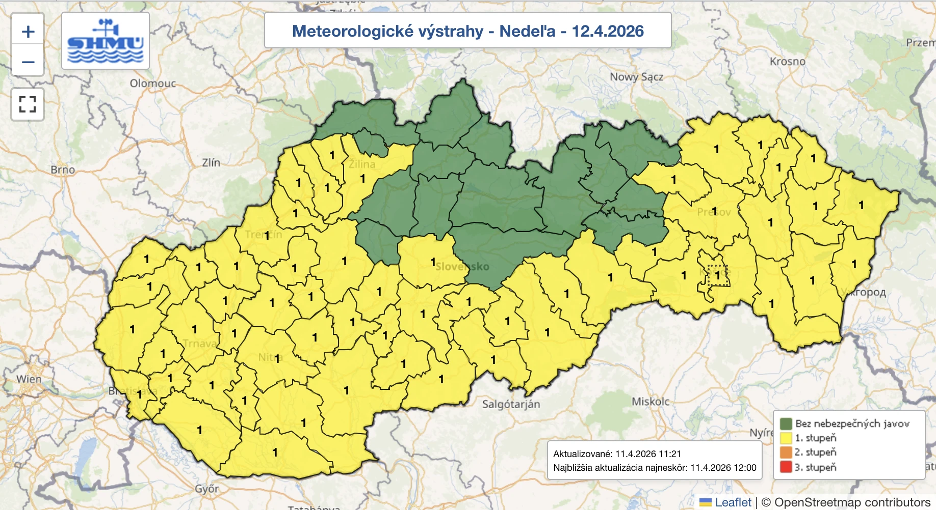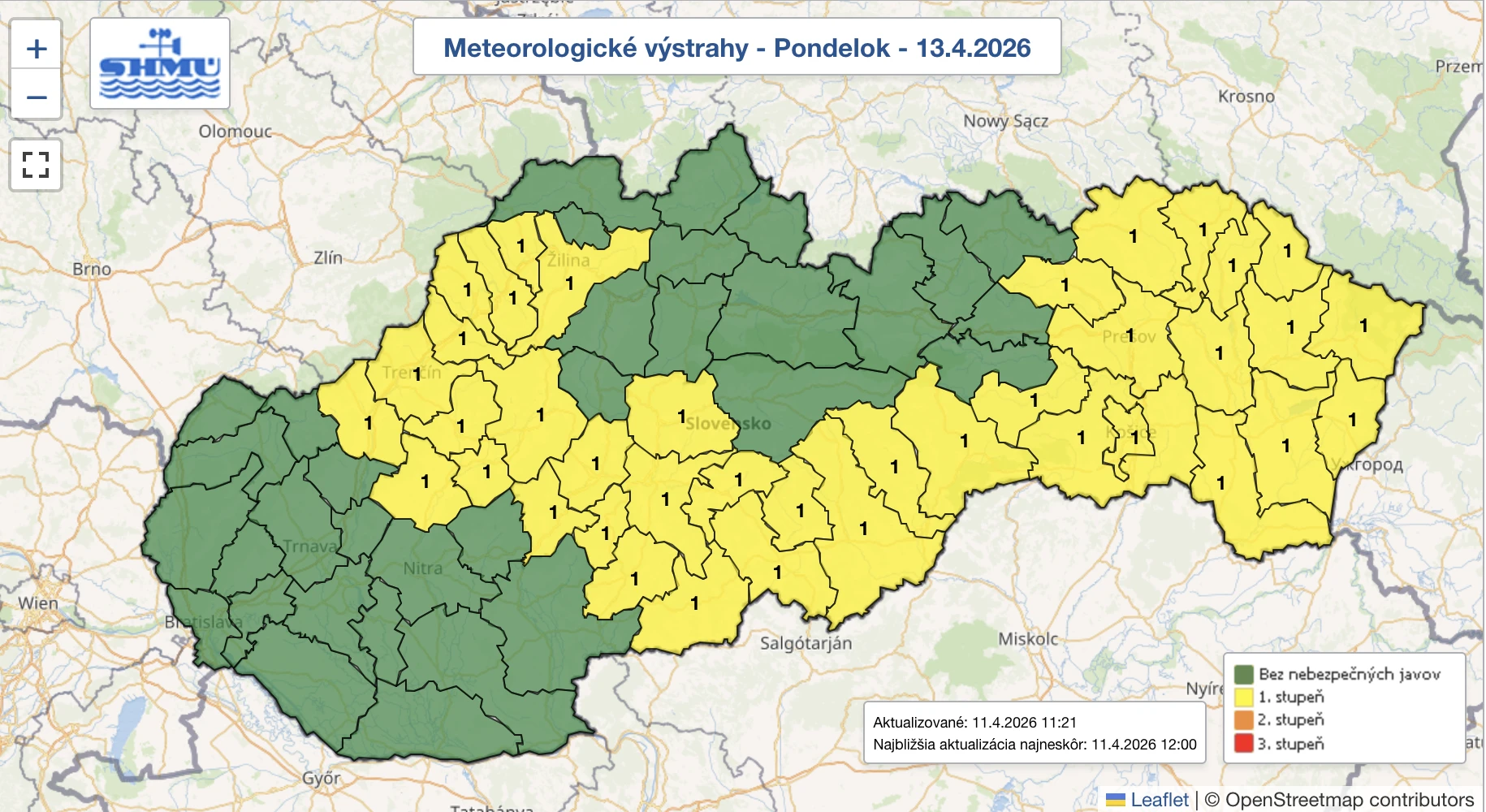 Meteorológovia na webe SHMÚ vydali výstrahu pred mrazom vo vegetačnom období na nedeľu 12. apríla v čase od polnoci do 08:00 hod. „V okrese Bardejov, Humenné, Medzilaborce, Prešov, Sabinov, Snina, Stropkov, Svidník a Vranov nad Topľou sa miestami očakáva prízemný mráz, ktorý predstavuje ohrozenie pre vegetáciu. Vo výške 2 metre nad povrchom sa očakáva dosiahnutie minimálnej teploty vzduchu -1 až -4 stupne Celzia,“ upozorňujú odborníci.