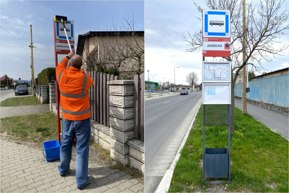 Zastávky MHD v Prešove prechádzajú jarným čistením. Dopravný podnik odstraňuje špinu, grafity aj nálepky a zároveň vymieňa označenia zastávok, aby sa cestujúci lepšie orientovali.