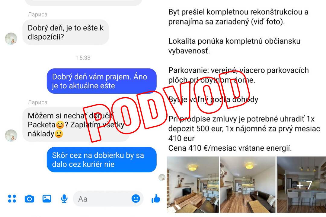 Podvodníci sa svoje obete väčšinou snažia nalákať na nízku cenu a pekné fotografie. Predajca komunikuje so záujemcom cez správy alebo telefonicky, pričom žiada uhradenie zálohy na vopred na účet. Obhliadka bytu však nie je možná. Majiteľ tvrdí, že je aktuálne odcestovaný niekde v zahraničí. Po zaplatení depozitu a prvého nájmu sa má vrátiť. Prisľúbi, že vám pošle kľúče. Byt ani peniaze ale nikdy neuvidíte.