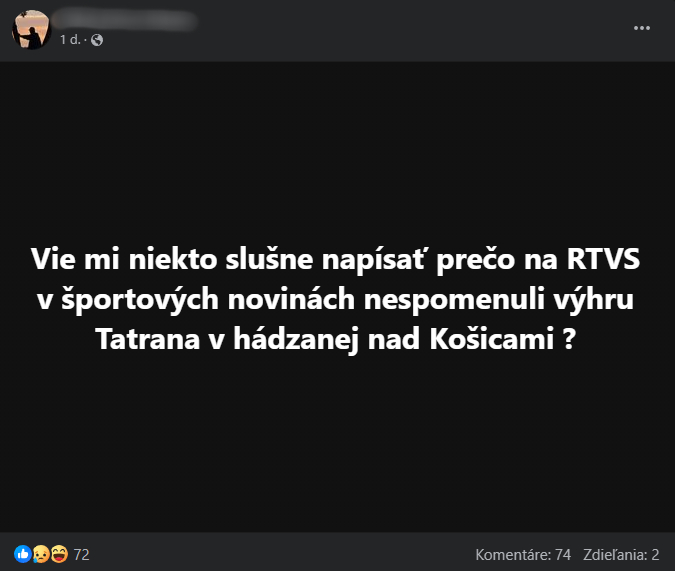 Rozhorčení Prešovčania sa pýtajú, prečo RTVS neodvysielala zápas domácich hádzanárov proti Košiciam. Súboj Tatrana proti HC Košice skončil debaklom „Vraňarov“, ktorí proti prešovským Tatranistom prehrali 43-27. „Vie niekto slušne napísať, prečo na RTVS v športových novinách nespomenuli výhru Tatrana v hádzanej nad Košicami?“ pýtal sa rozhorčený Prešovčan.