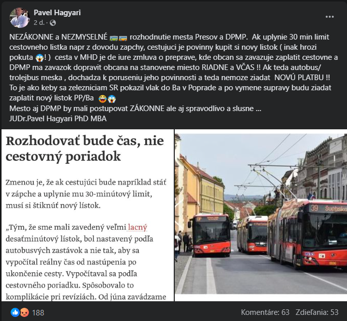 Prešovčanov využívajúcich služby Dopravného podniku mesta Prešov (DPMP) čakajú zlé časy. Pri súčasnej dopravnej situácii v krajskom meste sa môže ľahko stať, že pri bežnej ceste mestskou hromadnou dopravou (MHD) si cestujúci poriadne priplatia. „Ak uplynie 30 min limit cestovného lístka, napríklad z dôvodu zápchy, cestujúci je povinný kúpiť si nový lístok, inak hrozí pokuta,“ napísal na sociálnej sieti exprimátor Pavel Hagyari s tým, že rozhodnutie mesta a DPMP je podľa neho nezákonné a nezmyselné.