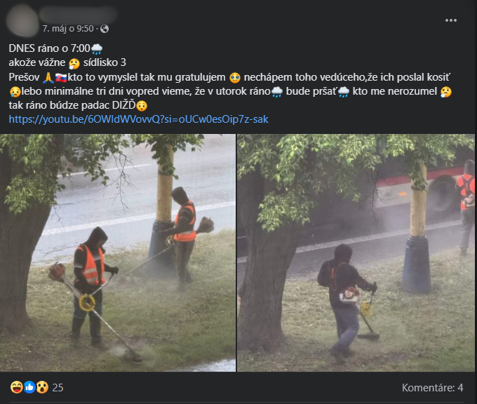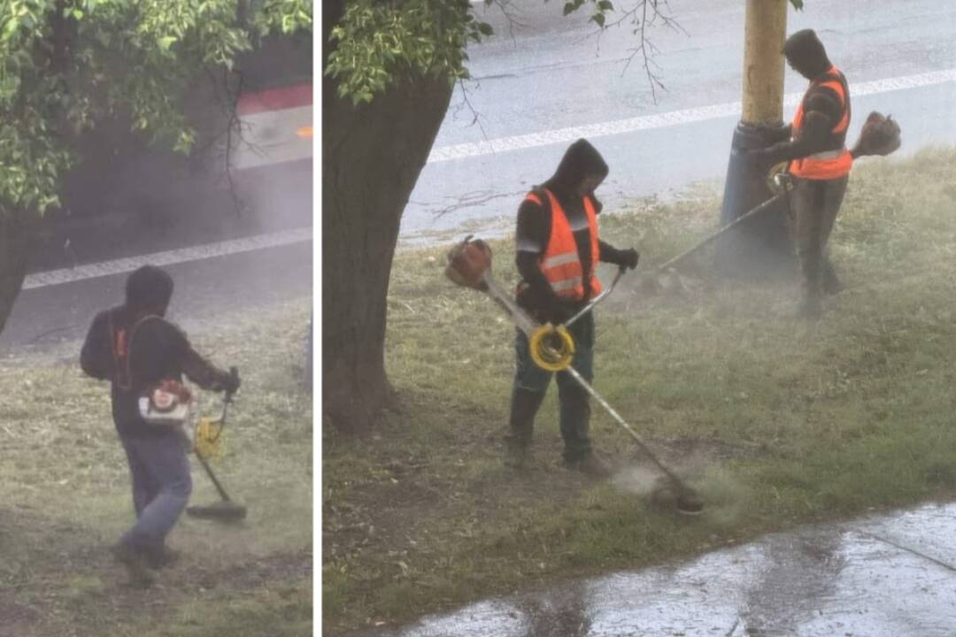 Do pracovných mundúrov a reflexných viest sa museli obliecť napriek nepriazni počasia. „Kto to vymyslel, tak mu gratulujem. Nechápem toho vedúceho, že ich poslal kosiť. Minimálne tri dni vopred vieme, že v utorok ráno (7. mája, pozn. red.) bude pršať,“ napísal k zverejneným fotografiám autor príspevku.