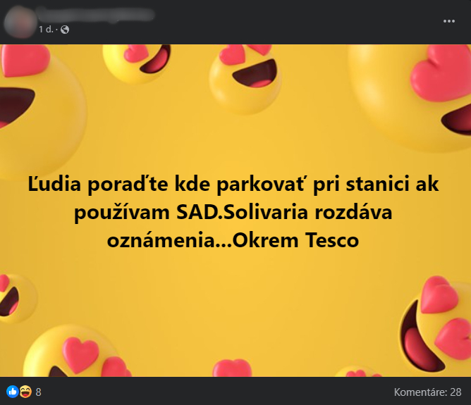Parkovacia situácia v Prešove, rovnako ako v iných väčších mestách, môže ľahko skomplikovať život. Miestni sa preto často radia o tom, čo robiť v prípade, ak plánujem využiť služby autobusového dopravcu SAD a niekde musí zanechať auto. „Ľudia, poraďte, kde parkovať pri stanici, ak používam SAD. Solivaria rozdáva oznámenia,“ pýta sa autorka na sociálnej sieti.