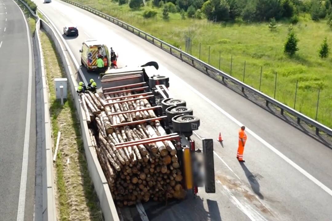 Kamionista nezvládol ľavotočivú zákrutu a prevrátil sa nabok aj s celým nákladom dreva. Podľa TV JOJ mal vodič vyjsť z kabíny sám ešte pred príchodom záchranných zložiek. Postarali sa o neho hasiči aj posádka sanitky.