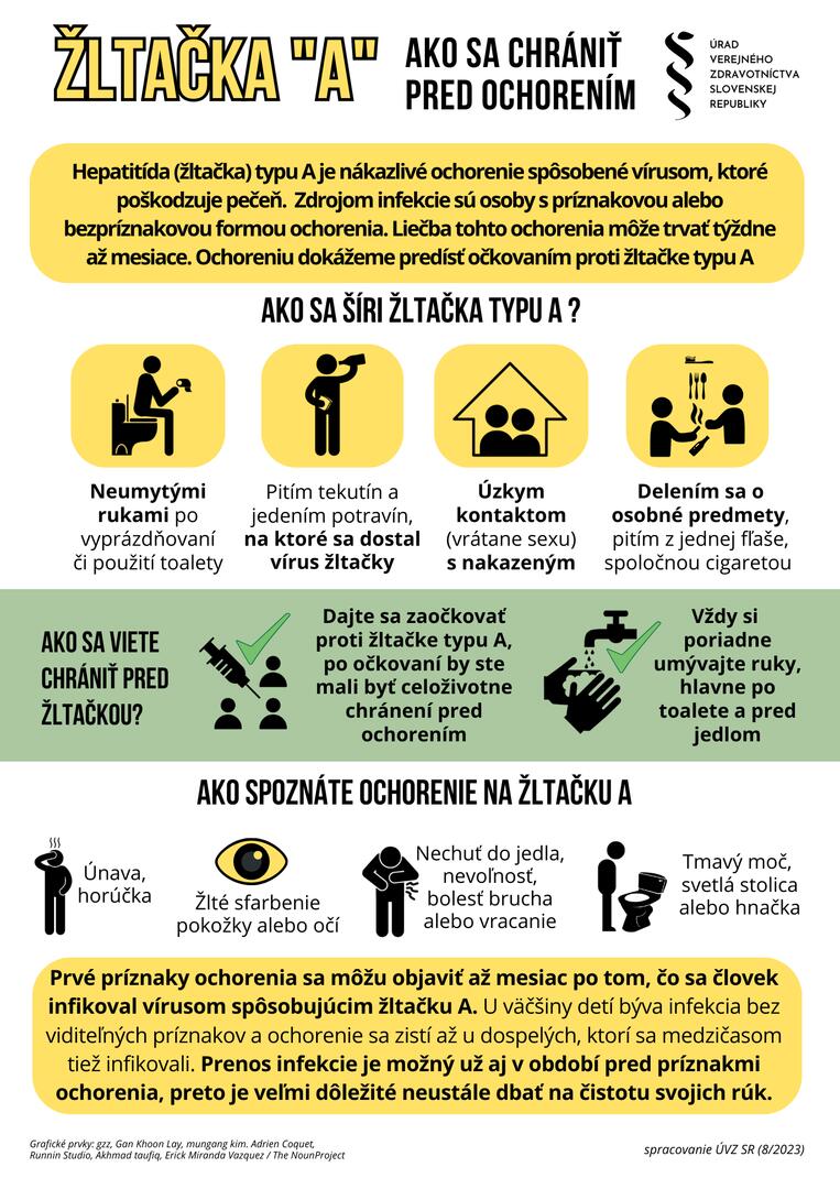 Podľa informácií z RÚVZ je hepatitída typu A, známa tiež ako „žltačka typu A“, infekciou, ktorá môže mať závažné následky na zdravie postihnutého. Príznaky ochorenia môžu zahŕňať únavu, horúčku, žlté sfarbenie kože alebo očí, nechuť do jedla, nevoľnosť, bolesť brucha a vracanie. Medzi ďalšie príznaky patrí tmavý moč a svetlá stolica.