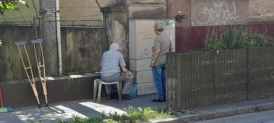 Muž o dvoch barlách, ktorý by sa mohol na svoj zdravotný stav vyhovárať a odpočívať, si obliekol montérky a rozhodol sa omietnuť stĺp na ulici. Vek ani fyzické obmedzenia ho neodradili. Pripravil si vedro, materiál a s ťažkou cementovou omietkou sa pustil do práce. Jeho manželka, ktorá na neho dohliadala, bola očividne hrdá na jeho úsilie.