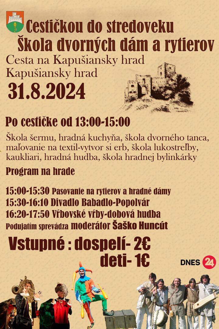31. augusta 2024 sa na Kapušianskom hrade bude odohrávať jedinečná akcia, ktorá vás a vaše deti prenesie priamo do čias, keď vládli rytieri, dvorné dámy a šermiari. Hrad ožije stredovekými hrami, dobovou hudbou a aktivitami pre celú rodinu. Ak máte chuť na skutočné dobrodružstvo, „Cestičkou do stredoveku – Škola dvorných dám a rytierov“ je práve pre vás.