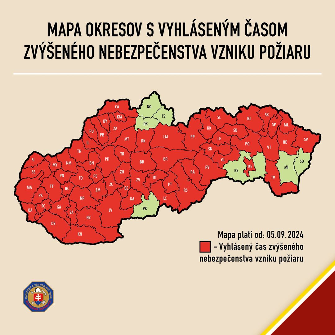 V súvislosti s vysokými teplotami, ktoré naďalej sužujú územie Slovenska, uverejnil Hasičský a záchranný zbor na sociálnej sieti mapu s okresmi, v ktorých je vyhlásený čas zvýšeného nebezpečenstva vzniku požiaru.