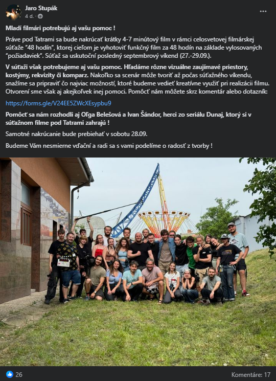 Mladí filmári spod Tatier potrebujú vašu pomoc. Hľadajú zaujímavé priestory, kostýmy aj komparz