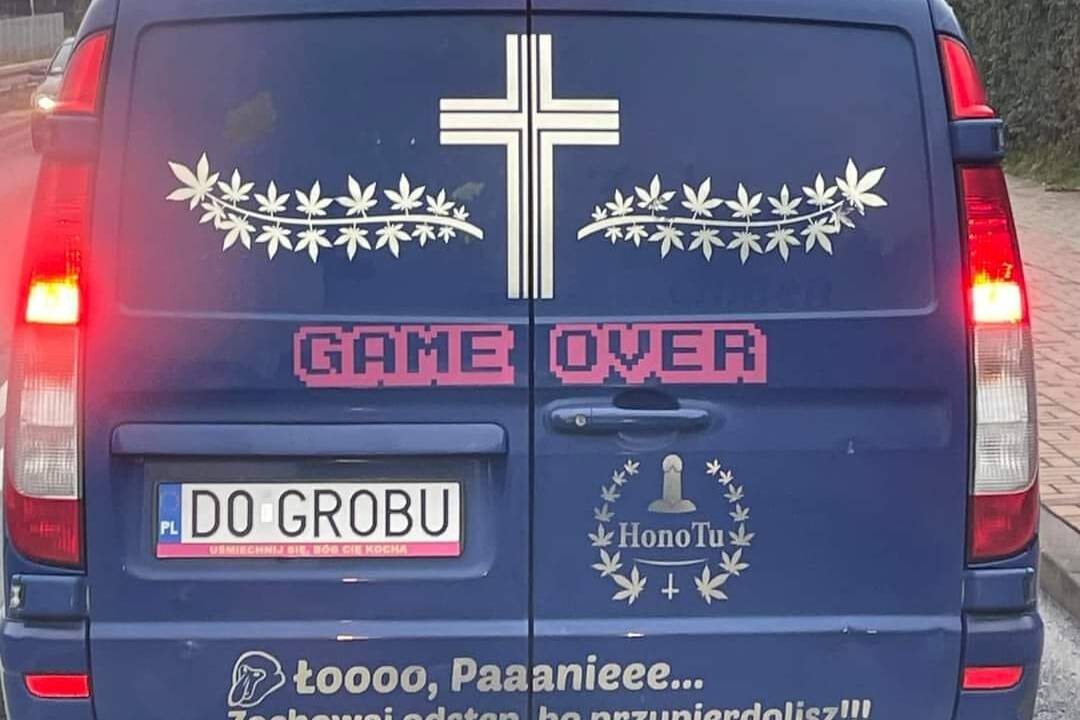 Kúsok za slovenskými hranicami sa na cestách majitelia firiem rozhodne nezastavujú pred ničím. Prešovský šofér spozoroval na ceste vozidlo, ktoré ho okamžite zaujalo nielen svojim vzhľadom, ale aj svojským čiernym humorom. Na zadnej časti evidentne pohrebného vozidla sú totiž veľavravné nápisy, ktoré nejednému vodičovi napriek všektému vyvolajú úsmev na tvári – na ŠPZ sa skvie text „DO GROBU“ a hneď nad ním výrazný nápis „GAME OVER“. Tým to však nekončí, nižšie vodičov varuje ďalší humorný nápis: „Łooo, Paaniee... Zachowaj odstęp, bo przypierdolisz!!!“ (vo voľnom preklade: „Panečku, udrž odstup, lebo nabúraš!“).