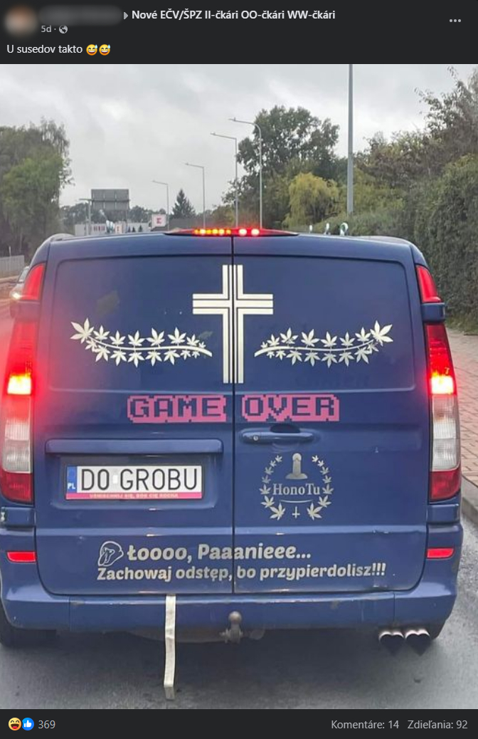 Zdroj: Facebook/ Nové EČV/ŠPZ II-čkári OO-čkári WW-čkári/ L. B.Aj keď ide o pohrebné auto, humor majiteľov ukazuje, že aj vo vážnych oblastiach života sa dá zachovať nadhľad a občas aj úsmev. Takže ak sa niekedy ocitnete na poľských cestách, dávajte si pozor – môže vás dohnať niečo viac než len pokuta za rýchlosť.