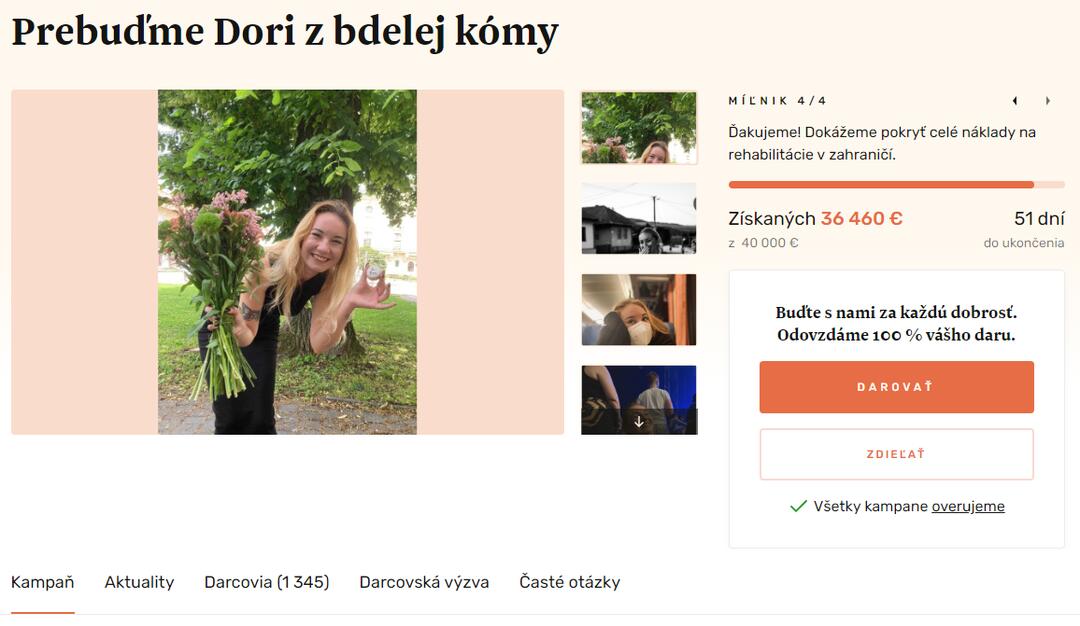 „Na Slovensku neexistujú zariadenia pre ľudí v bdelej kóme, preto je jediná šanca hospitalizácia v zahraničných centrách,“ píšu priatelia vo výzve. Poisťovne však liečbu nepreplácajú, preto všetky vyzbierané prostriedky pôjdu priamo na Dorotkinu dlhodobú hospitalizáciu. Blízki a rodina prosia o pomoc, aby Dorotke poskytli šancu na uzdravenie a návrat do života.