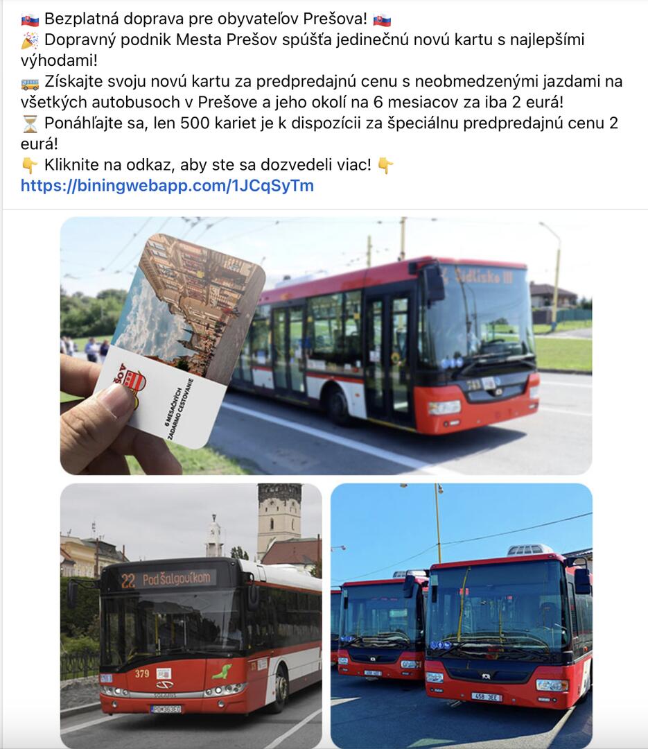 Prešovčania, buďte opatrní. Na sociálnej sieti sa objavila stránka Dopravná doprava v Prešove a stránka Doprava v Prešove, ktoré ponúkajú cestujúcim výhodnú prémiovú kartu. Dopravný podnik mesta Prešov však upozorňuje, že ide o podvod.