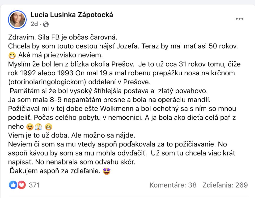 Lucia po rokoch nabrala odvahu a na sociálnej sieti uverejnila prosbu o pomoc pri pátraní po Jozefovi, ktorého stretla pred viac ako 30 rokmi na ORL oddelení v Prešove. Lucia nevie jeho priezvisko, no mal by pochádzať z okolia Prešova. V nemocnici sa stretli približne v roku 1992 alebo 1993 a aj po takej dobe sa mu chce poďakovať za to, že jej spríjemnil nemocničný pobyt.