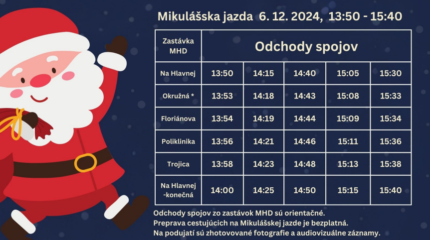 Kedy a kadiaľ? Mikulášsky autobus vyrazí o 13:50 z MHD zastávky Na Hlavnej. Jeho trasa povedie cez Okružnú, Floriánovu, Polikliniku a Trojicu a následne sa vráti späť na Hlavnú ulicu. Cestovanie v autobuse bude trvať do 15:40. Aby atmosféra bola dokonalá, zastávky na trase budú vyzdobené mikulášskymi čiapkami.