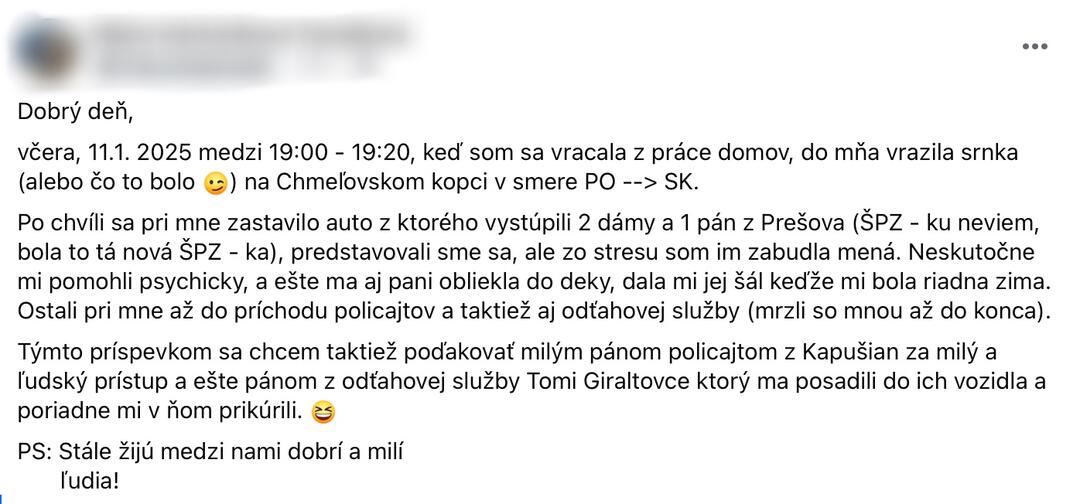 Používateľka Mária na sociálnej sieti zdieľa informácie o nepríjemnej nehode, ktorá sa jej stala v sobotu 11. januára okolo 19:00 hod. Počas toho, ako šla autom cez Chmeľovský kopec smerom z Prešova, jej do cesty vbehla srnka, s ktorou sa zrazila.
