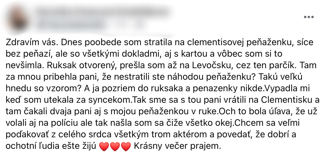 Dobrí ľudia ešte stále existujú a dôkazom je aj príbeh mamičky Veroniky, ktorá takmer prišla o svoju peňaženku a všetky doklady, ktoré v nej mala. Veronika sa na sociálnej sieti podelila o skúsenosť s dobrými ľuďmi, ktorú v Prešove zažila.