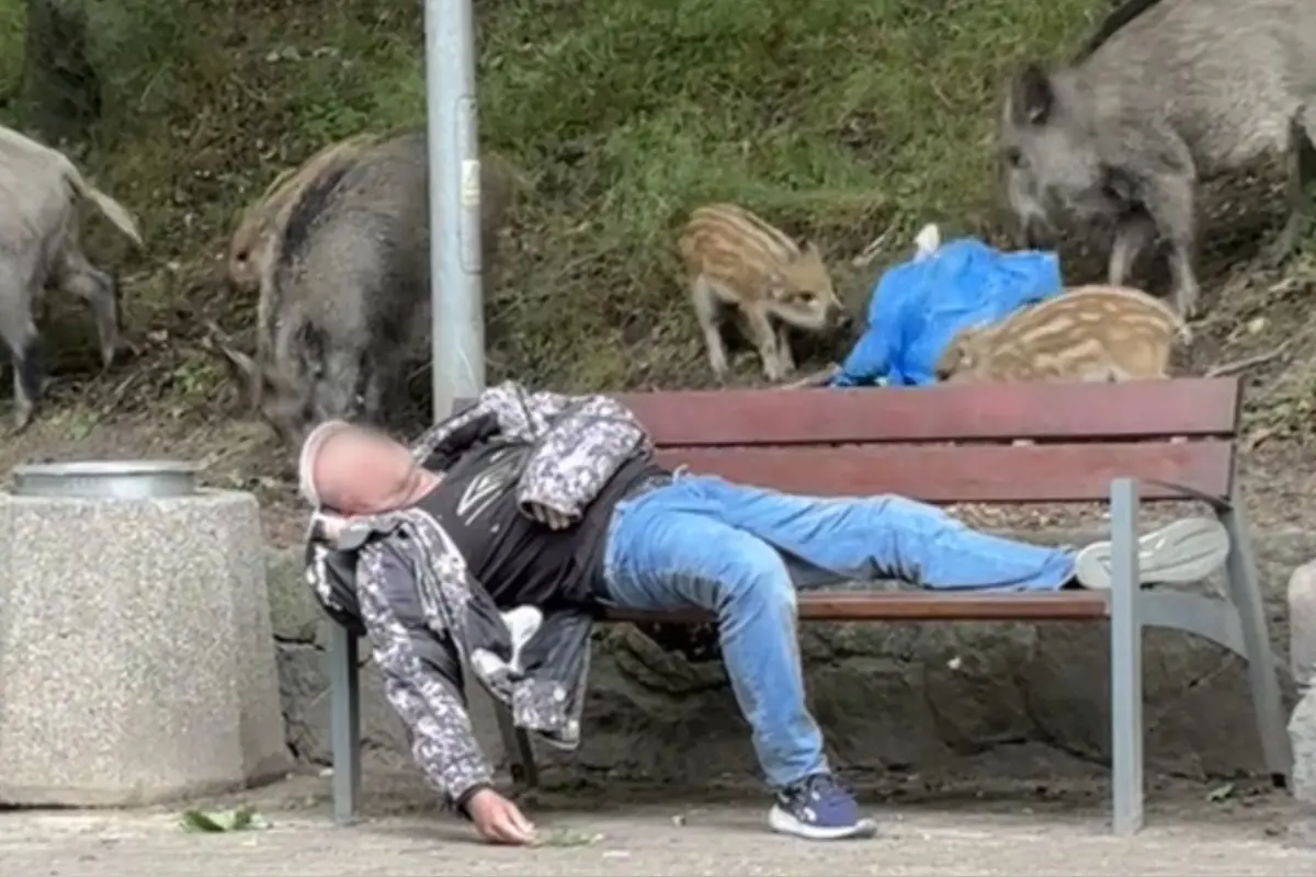 Muž spí, ani sa nepohne. Vedľa neho – priamo za lavičkou – sa však odohráva nečakaná scénka: tri dospelé diviaky a tri mladé si s veľkým záujmom prezerajú jeho tašku. Hlavy zaborené do plastu, ňufáky sa im mihajú okolo spiaceho tela. A on? Ako keby nič. Ani meter od neho sa to hemží zverou a on si sníva sladký sen.