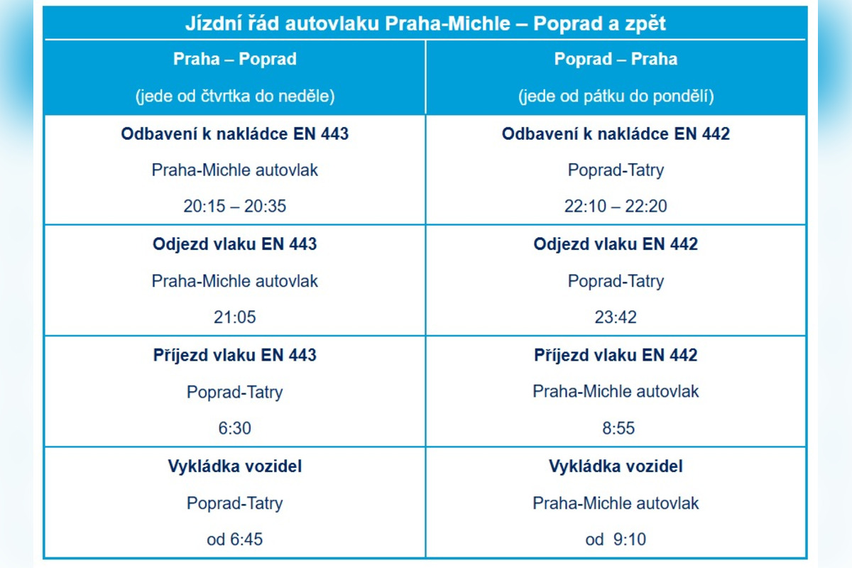 Obľúbený autovlak, ktorý spája Prahu s východným Slovenskom, sa opäť vracia do „starých koľají“. Po polročnej prestávke súvisiacej so sťahovaním pražského terminálu z hlavnej stanice do priestorov prevádzkovej jednotky Českých dráh v Michli začne autovlak znova premávať po svojej obvyklej trase.