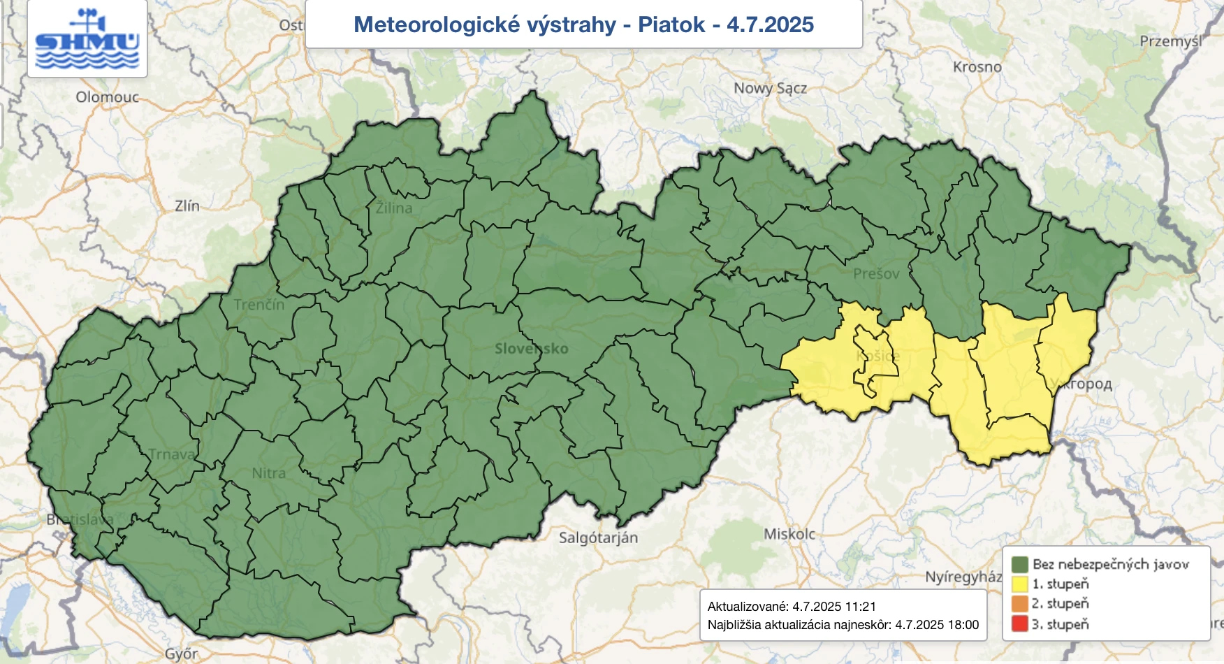 Kým ešte vo štvrtok platili pre Prešovský kraj výstrahy pred vysokými teplotami, koniec pracovného týždňa priniesol zmenu. Slovenský hydrometeorologický ústav vydal pre viaceré oblasti Slovenska výstrahy pred búrkami.