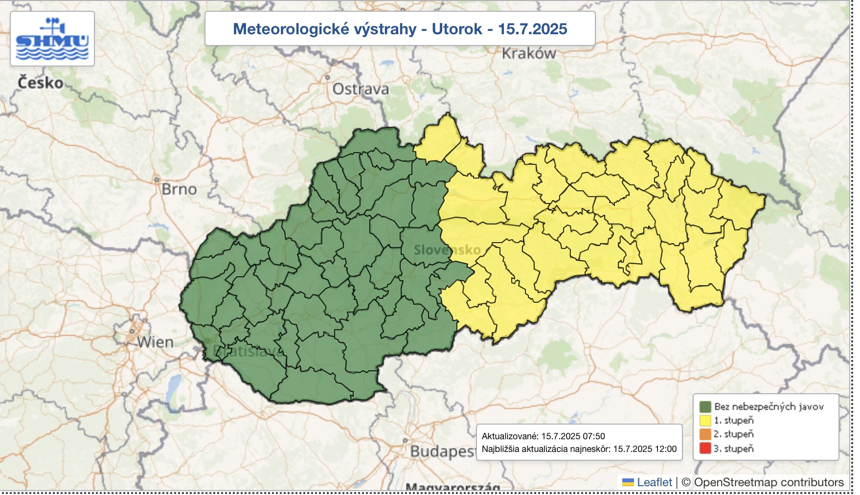 Meteorológovia varujú pred výstrahami aj počas utorka 15. júla. Pre všetky okresy Prešovského kraja platia od 12:00 do 20:00 hod. výstrahy prvého stupňa pred búrkami.
