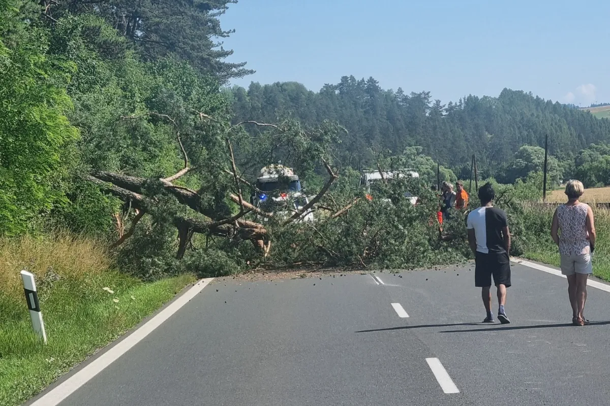 Na rázcestí medzi Podhoranmi a Holumnicou je na ceste spadnutý strom. Ak môžete, úseku sa vyhnite, čaká vás tam zdržanie.