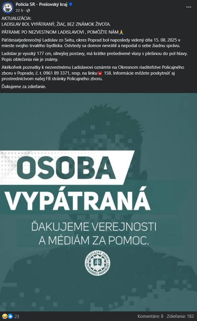 Žiaľ, o niekoľko hodín neskôr prišla smutná aktualizácia. „Ladislav bol vypátraný, žiaľ, bez známok života,“ uviedla polícia.