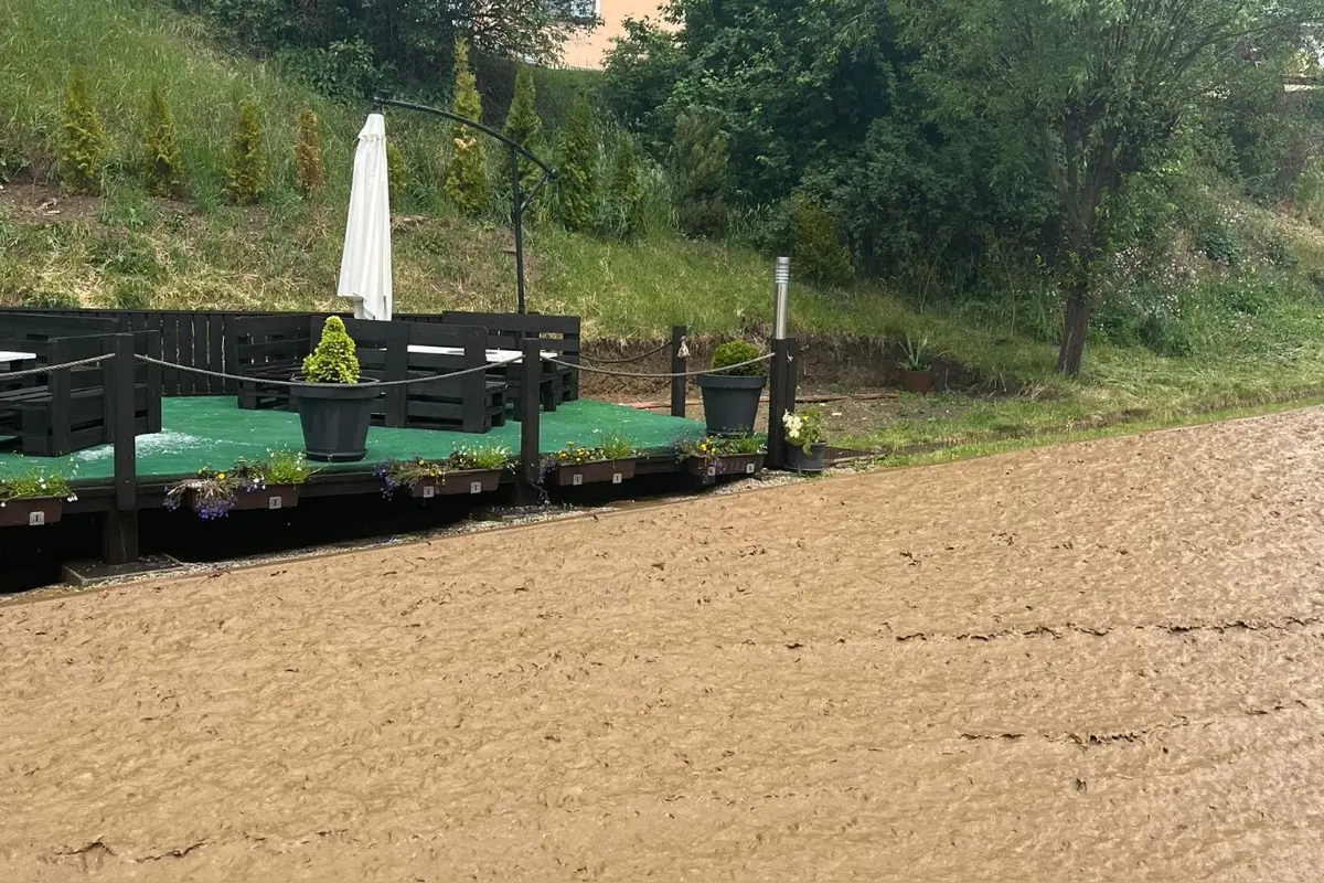 VIDEO+ Kežmarkom sa prehnal silný dážď s krúpami, zatopil cestu na jednej ulici